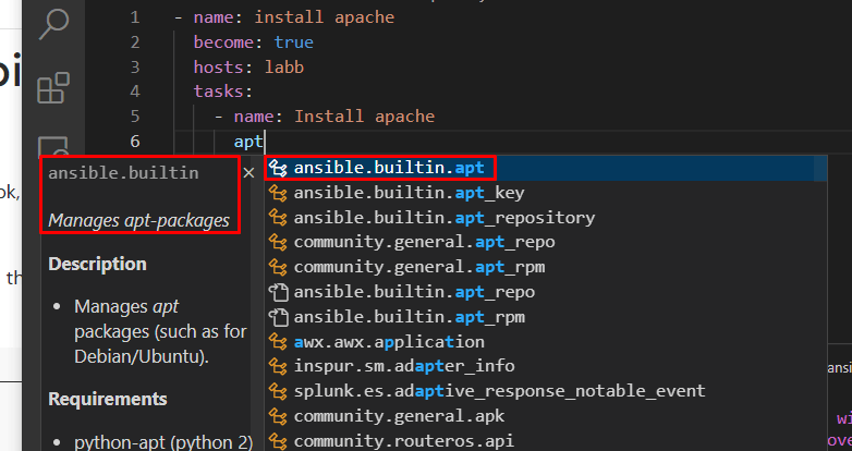 I did not need to check the Ansible documentation for this, the extension VScode did all the magic. I just entered “apt”, and it suggested the module for me.